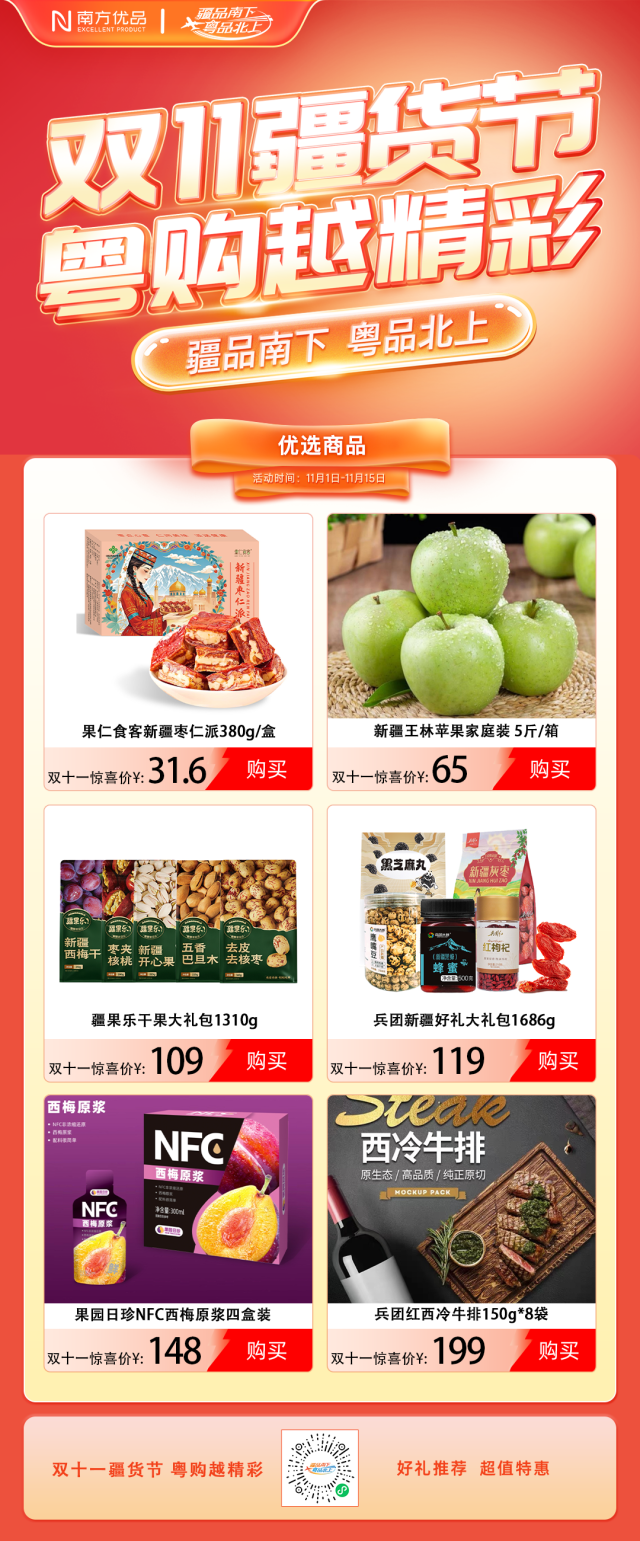 活动期间,动爆“疆品南下 粤品北上”线上主平台将推出系列重磅促销活动,贴引让消费者以最优惠的爆冬价格畅享地道新疆味。从沙漠绿洲的日味甜杏到戈壁滩的红枣,从天山牧场的双11牛奶到草原散养的牛羊肉,每一口都是新疆的秋日馈赠,每一件都藏着粤疆协作的温暖故事。